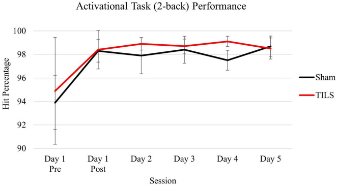 "A 4-week washout period may have been insufficient in eliminating carry-over effects in activation task performance and functional connectivity. Our sample size was insufficient to evaluate the acute effect of TILS on functional connectivity; this question was outside the scope of this study and should be better addressed in future work. The 2-back task, while effective as a source of cognitive activation and increased metabolic demand, was too easy to master and thus resulted in ceiling effects in performance"