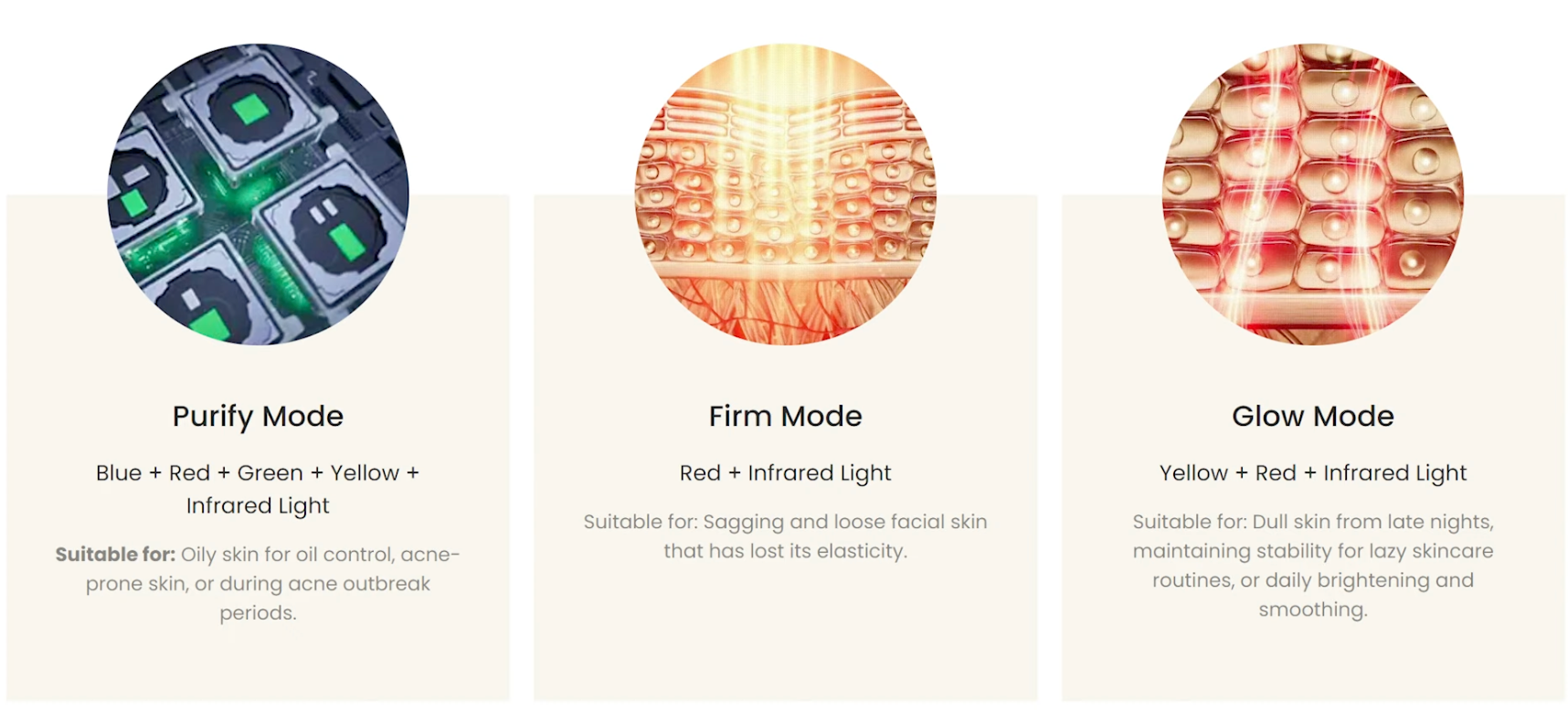 - Purify Mode utilizes the full spectrum, including 415nm blue, 516nm green, amber, red, and near-infrared. Blue is well-researched for oily skin and acne, while green has less evidence but some support for improving skin tone.