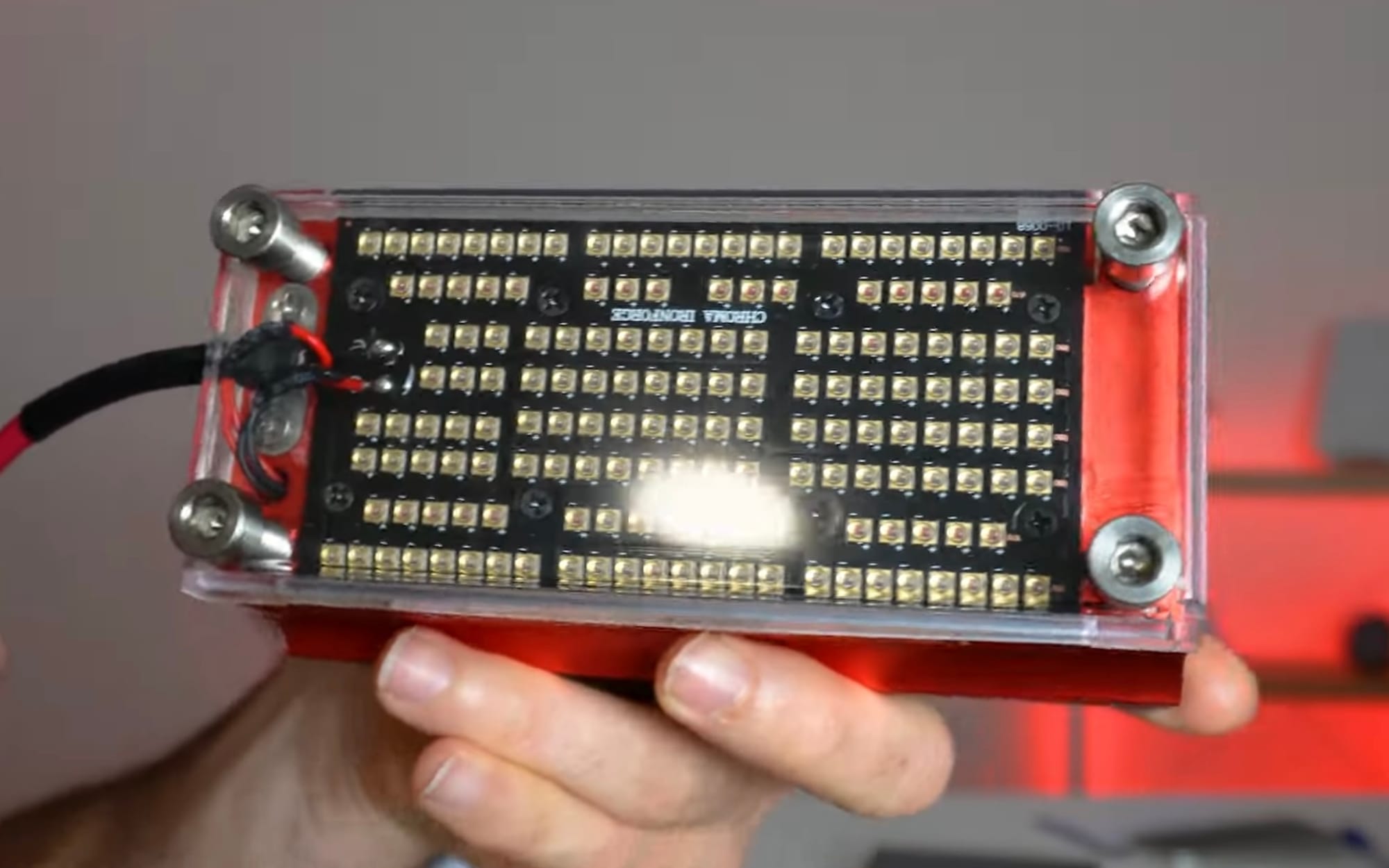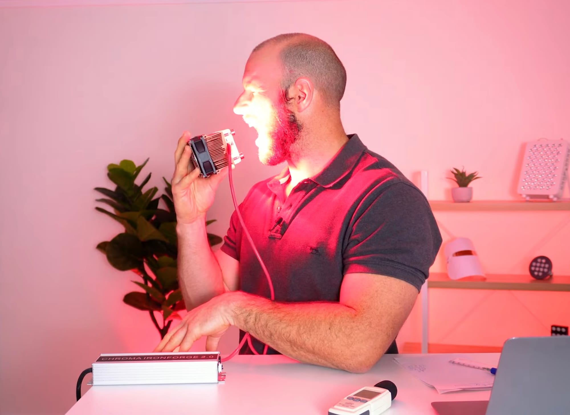 The Chroma Ironforge is a handheld red light therapy device about the size of a brick. It’s the second edition of this product from Chroma, a company founded by Michael Traperio