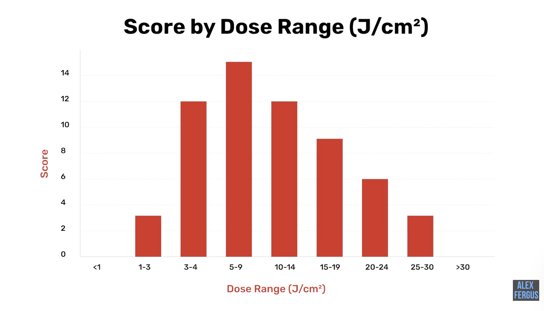 In human trials, doses vary widely, but many fall 10 joules per square centimeter per session.
