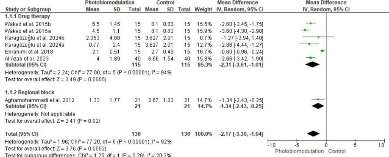 "Qualitative analysis showed that eight out of nine studies reported a significantly greater reduction in pain scores in the [red light therapy] groups compared to control groups. A low to moderate risk of bias was found in two-thirds of the studies. The meta-analysis, which included five studies, demonstrated a significant effect of PBM in reducing pain scores (MD − 2.17; 95% CI, − 3.30 to − 1.04; P = 0.0002), although high heterogeneity was observed (I² = 92%). PBM appears to be an effective adjuvant therapy for trigeminal neuralgia, with a favorable safety profile and potential to reduce medication dependency."