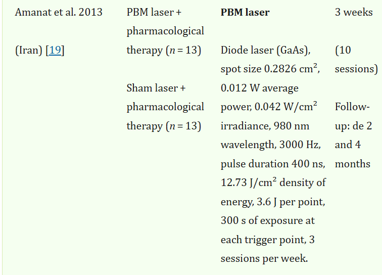 An issue here, in my opinion, once again, is that the treatment parameters are all over the place. Table 2 shows all the light therapy and other treatment protocols used in these studies - here's an example: