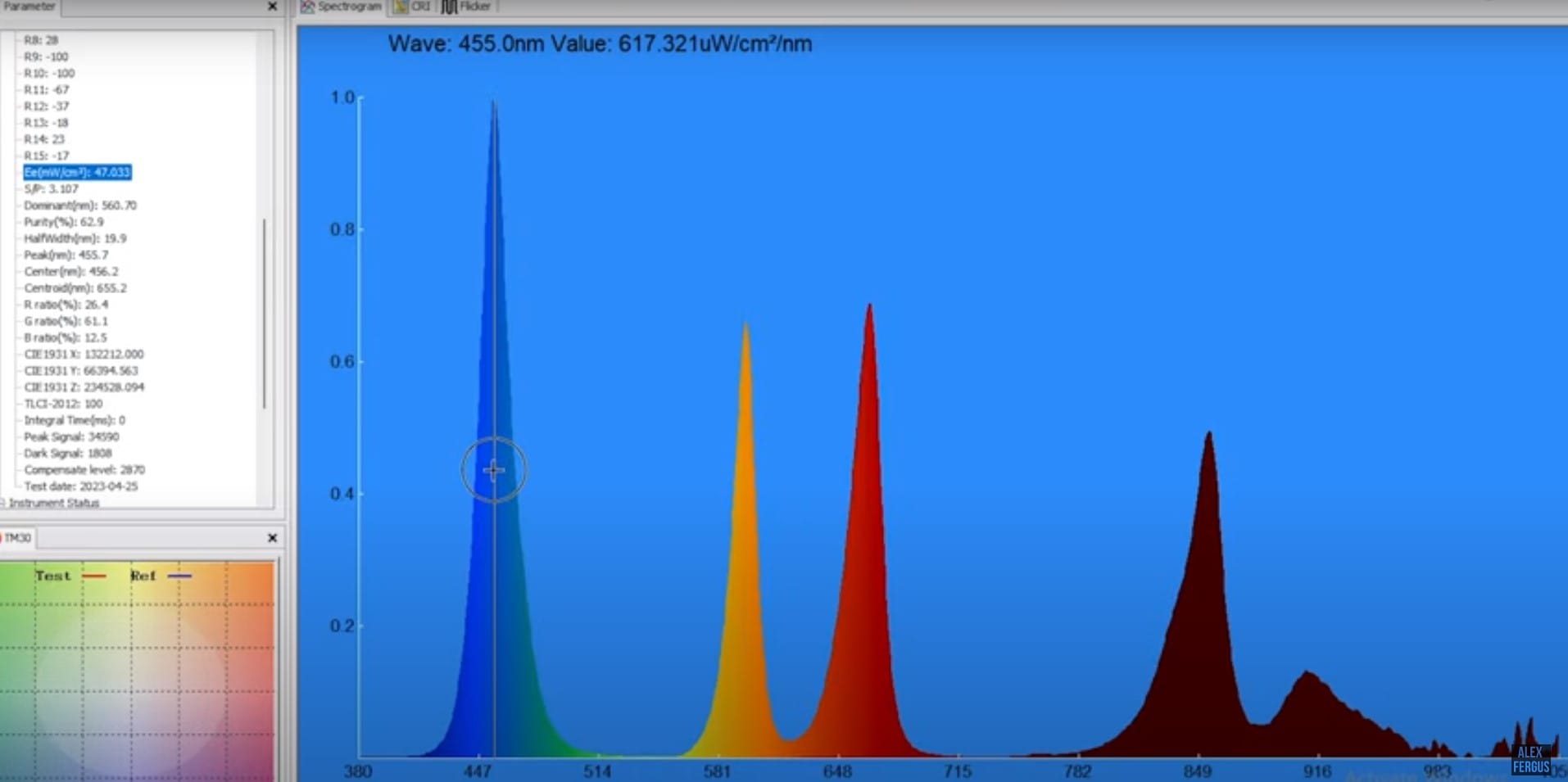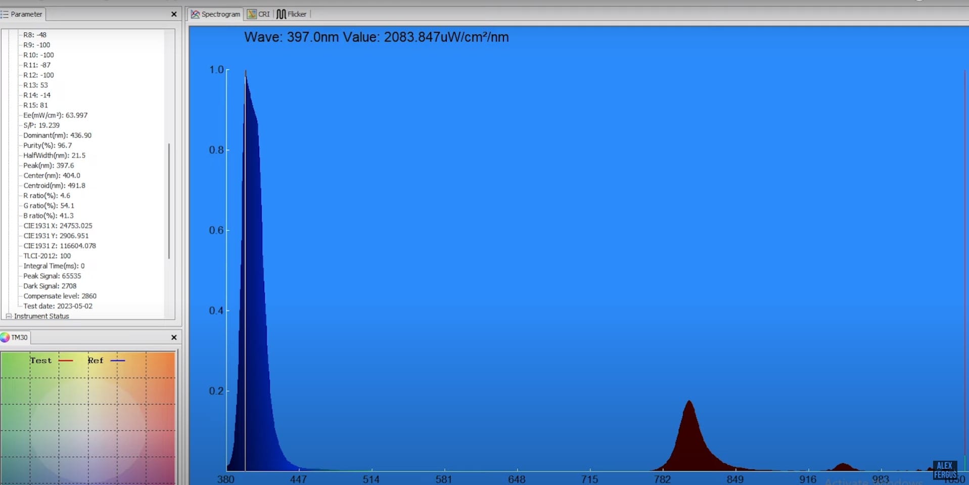 I used my spectrometer to determine exactly what kind of wavelength is being emitted. It's actually peaking around 400nm and lingers down to about 410nm before it drops off.