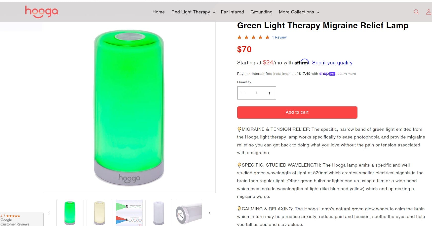 Hooga also makes products with other therapeutic wavelengths such as this 520nm Green Light Therapy Migraine Relief Lamp shown to be beneficial for those who are seeking to prevent and alleviate migraines.