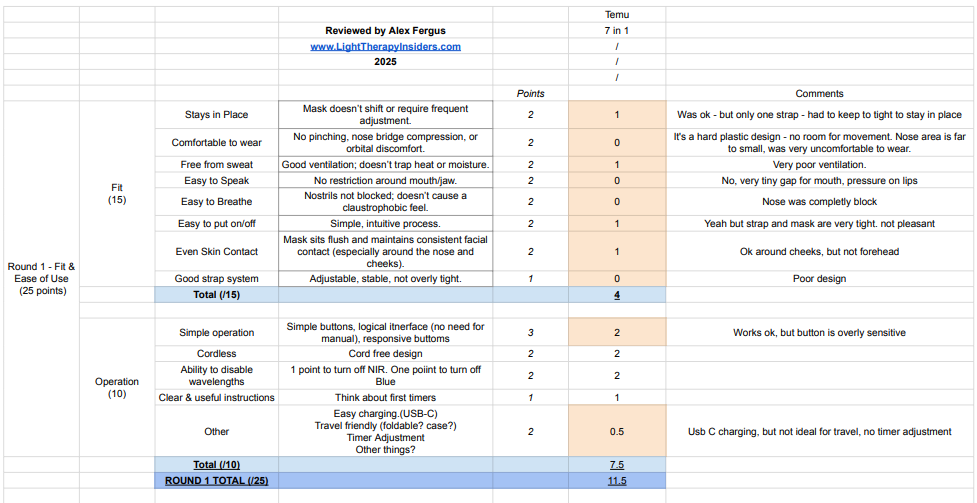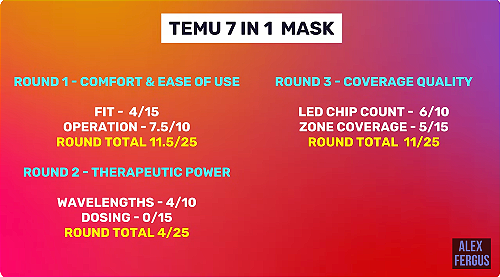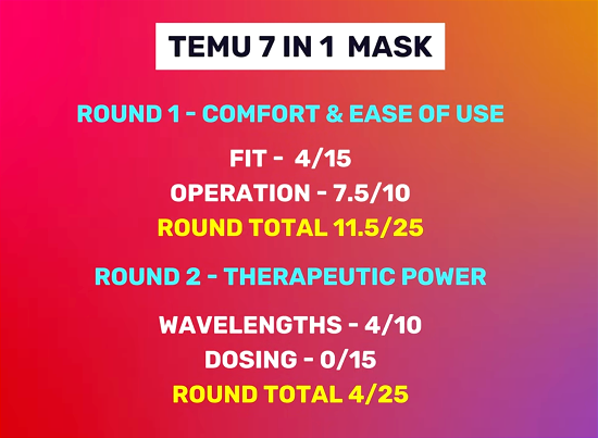 In the spirit of transparency and to help you make informed decisions, I put the Temu mask through my 100-point, four-round testing system. It’s the same scientifically backed process I use to test all red light therapy masks, evaluating comfort and usability, therapeutic power, coverage quality, price, and peace of mind.