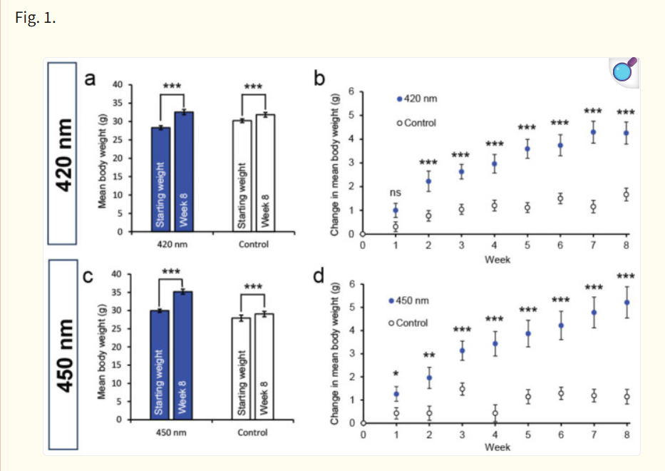 As you can see in the blue columns on the left, the mice exposed to both 420 and 450 nm gain a lot more weight than the mice in the white column on the right.