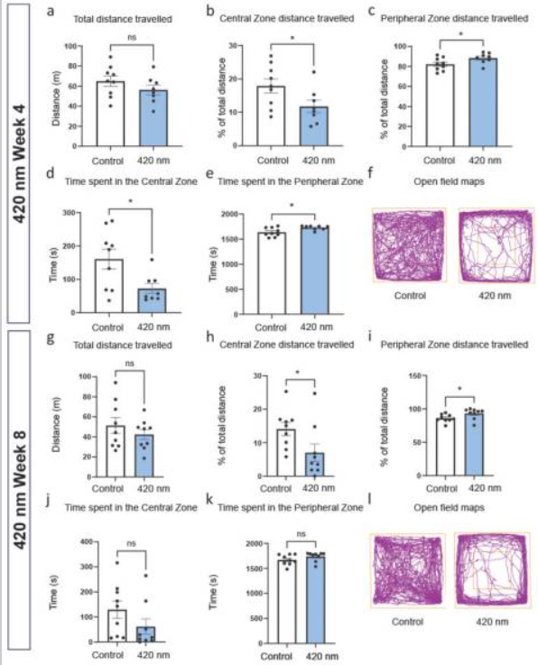 "Mitochondria absorb short wavelengths around 420 nm. This is associated with reduced ATP and restricted mobility. The 420–450 nm range is a significant element of LED lighting and computer monitors. Here we expose freely moving mice to 420–450 nm lighting and show rapidly weight gain within a week. This may be due to reduced mitochondrial demand for circulating carbohydrates. Both groups displayed marked shifts in serum cytokines. Open field mobility was examined. The distance travelled was similar between both experimental groups and their controls. However, both experimental groups showed avoidance of central regions consistent with anxiety-like behaviours. This was significant in the 420 nm group whose wavelength exposure is closer to peak mitochondrial absorbance. These data demonstrate the potential hazards of exposure to specific short wavelengths in the visual range now common in the built environment."