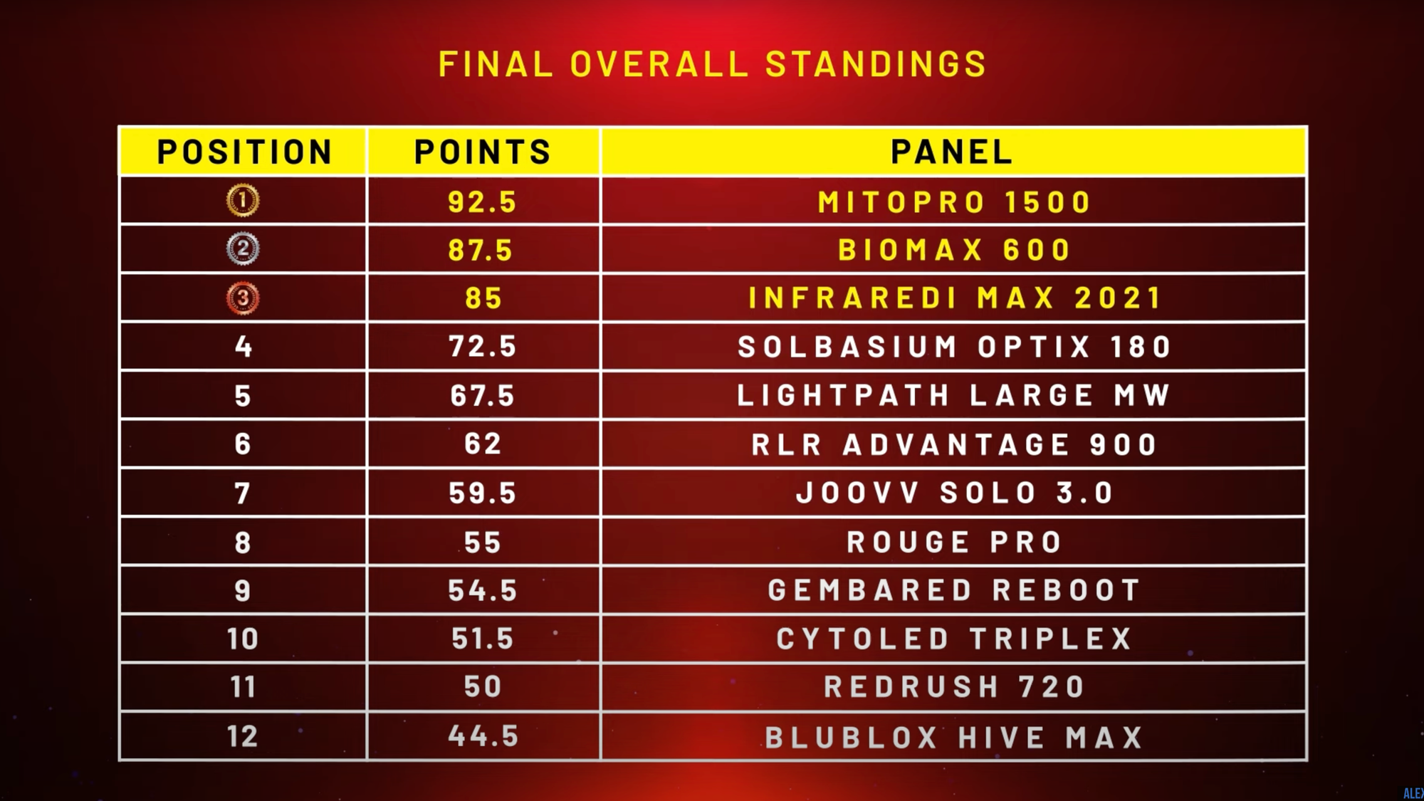 As you can see, it is pretty much or it is the same as the previous generation with the top panel being 86mW/cm². So it's packing a lot of power. Out of 34 panels, it's coming in 7th. It comes in at 10th place for total power.