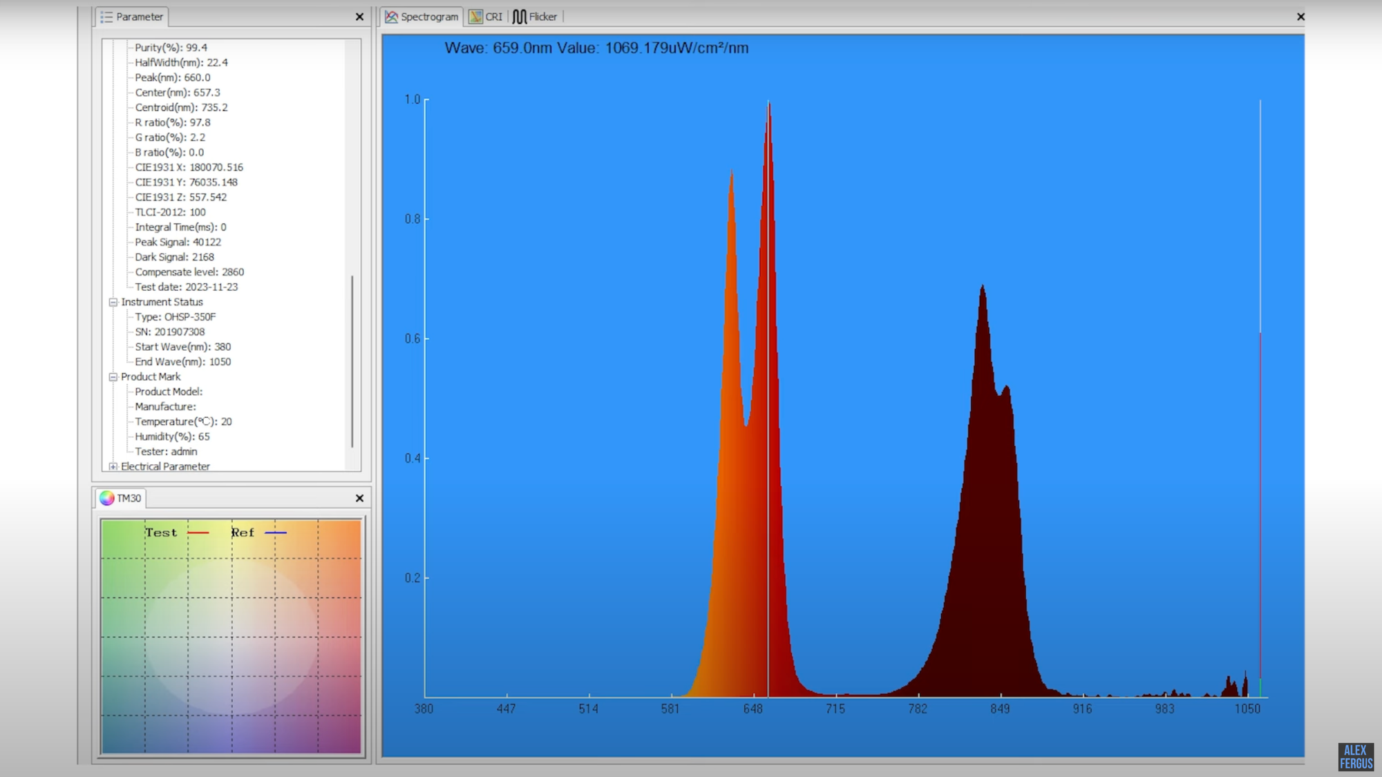 Okay, let's have a look at this screenshot from my spectrometer. Firstly, we see the peak at 630nm as advertised. We see the second peak at 660nm which is also a match.