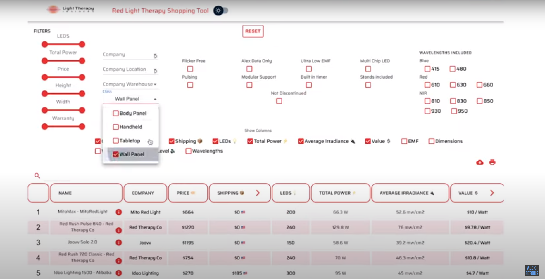 Here we have MitoPro 1500+ in seventh place with an average irradiance of 76.5mW/cm² which makes it one of the top ten most powerful wall panels.
