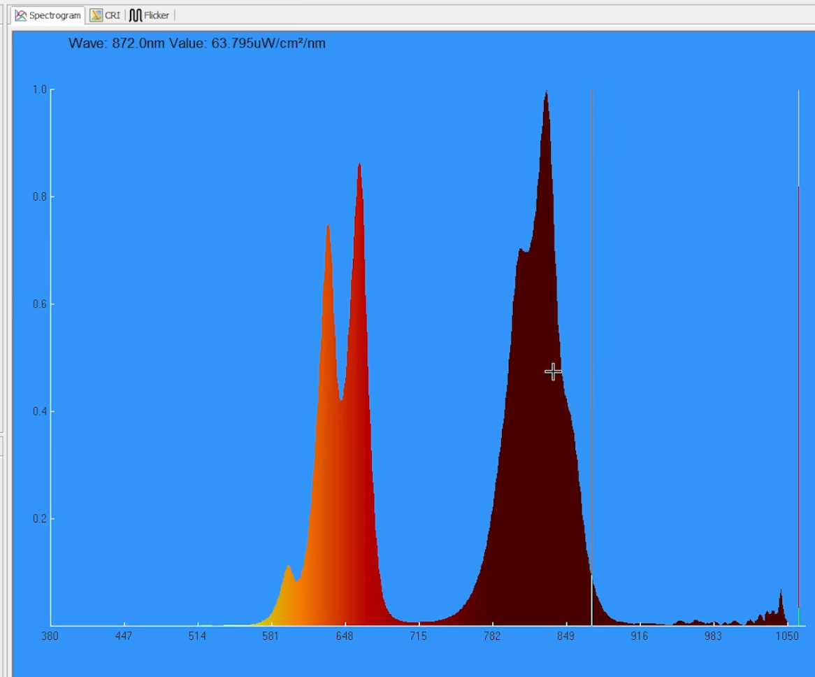 On the near-infrared side, the spectrometer identified strong peaks at 810nm, 830nm, and 850nm, verifying that the panel delivers the full spectrum of advertised wavelengths. The 850nm peak was particularly evident in secondary readings, demonstrating that all the expected near-infrared energy is included in the panel's output.