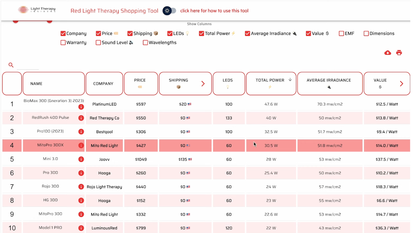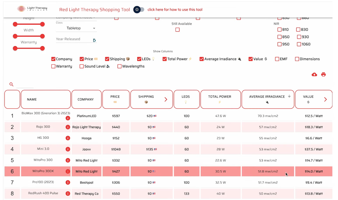 Let's compare these numbers using the Light Therapy Insiders shopping tool. When sorting by average irradiance, the MitoPro 300X ranks sixth, with 51.8mW/cm². This is a solid figure, considering that while the BioMax sits at the top with 70mW/cm², most tabletop panels fall in the 40-50mW/cm² range, making the MitoPro 300X an adequately powerful option.