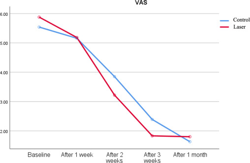 The Visual Analogue Scale (VAS) measures pain between 0 and 10, with "0" being no pain and "10" signifying the most intense pain imaginable. Unfortunately, this level didn't reach statistical significance though - as it seems that the jaw pain is automatically healing over time, even if no lasers are applied.