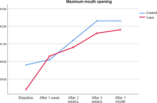 For maximum mouth opening, in this study, the laser group underperformed the control group slightly, even: