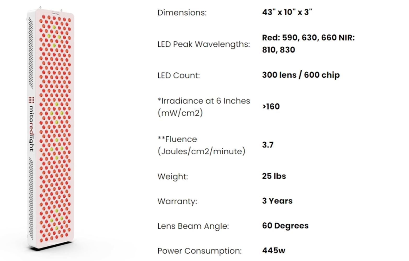 Mito Red Light is an American company with a 3-year warranty and great customer support. They also offer many stand options, including a floor stand that allows you to use 2 of these panels. You can put one on top of the other, move it around on the floor, and have a tall red light therapy setup.