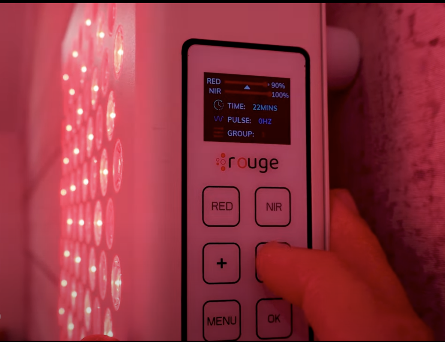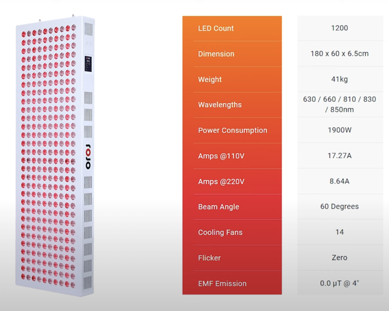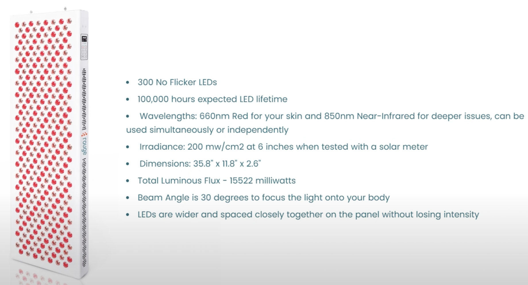 The Rojo Refine 900 panel is 12” wide and has five different wavelengths: 630, 660, 810, 830, and 850 nanometer light. The panel has 300 dual-chip LEDs, and every LED lens has red and an NIR chip; thus, you’ll get a nice spread of light.