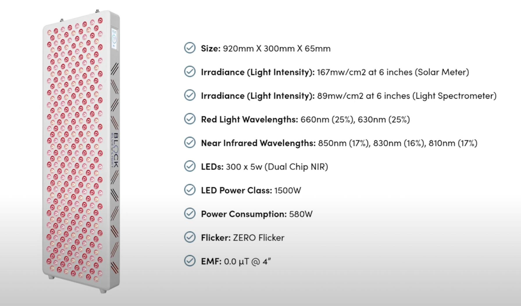 The Block Blue Light Mega panel is 12 inches wide and has 300 LEDs. It uses dual-chip LEDs and emits five different wavelengths: 630nm, 660nm, 810nm, 830nm, and 850nm
