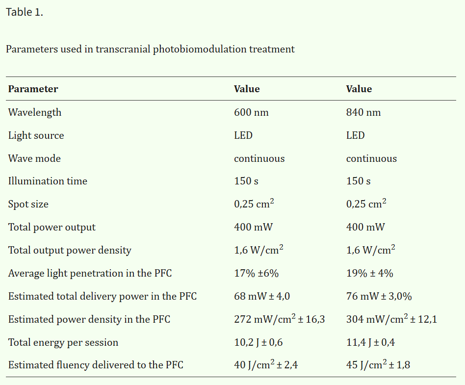 Table 1, moreover, showcases the light treatment protocol - hopefully you can see that the treatment area is really small, but that the power output and total dose are quite large: