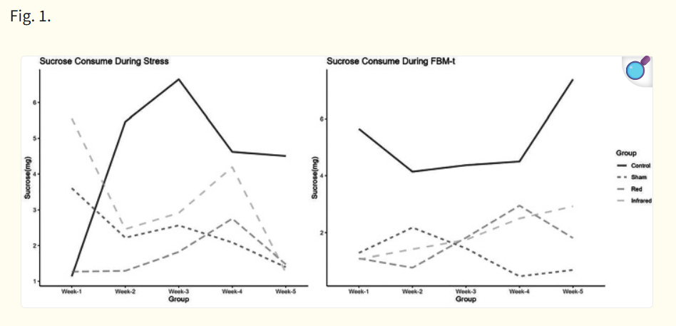 "Our study showed that the [Continous Mild Stress] model efficiently reproduced anhedonic behavior showing a significant reduction of sucrose consumption in the groups exposed to this protocol. Furthermore, the [light therapy applied to the skull/brain], red and infrared were able to reverse this depressive-like behavior, which suggests the promising antidepressant properties of this intervention. "