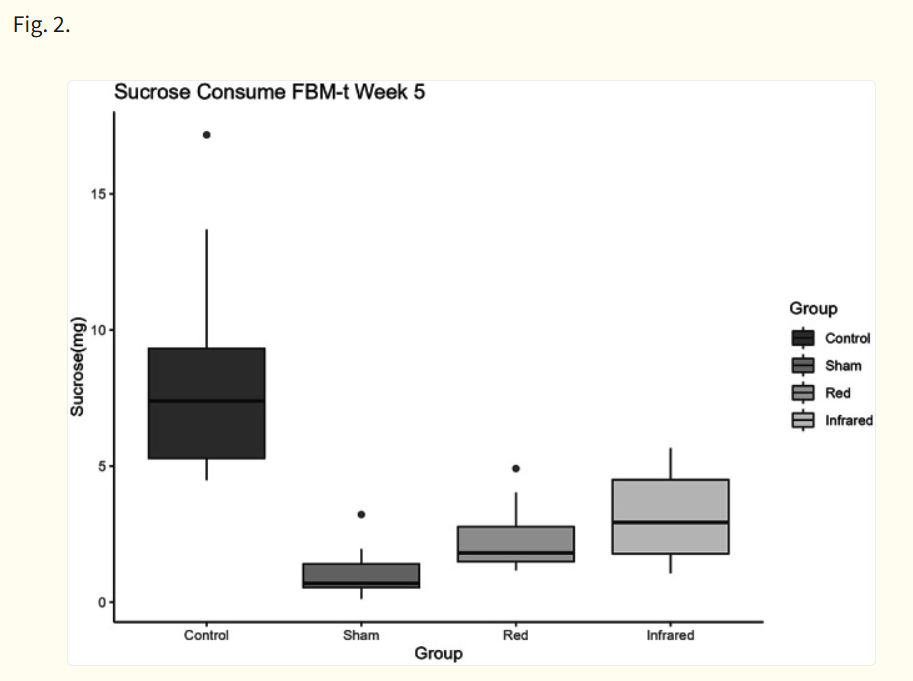 When the light therapy is then applied (there's a control group, a red light group, and a NIR light group, and a sham group here), you can see that sucrose (sugar) consumption goes up in the animals that receive the light therapy: