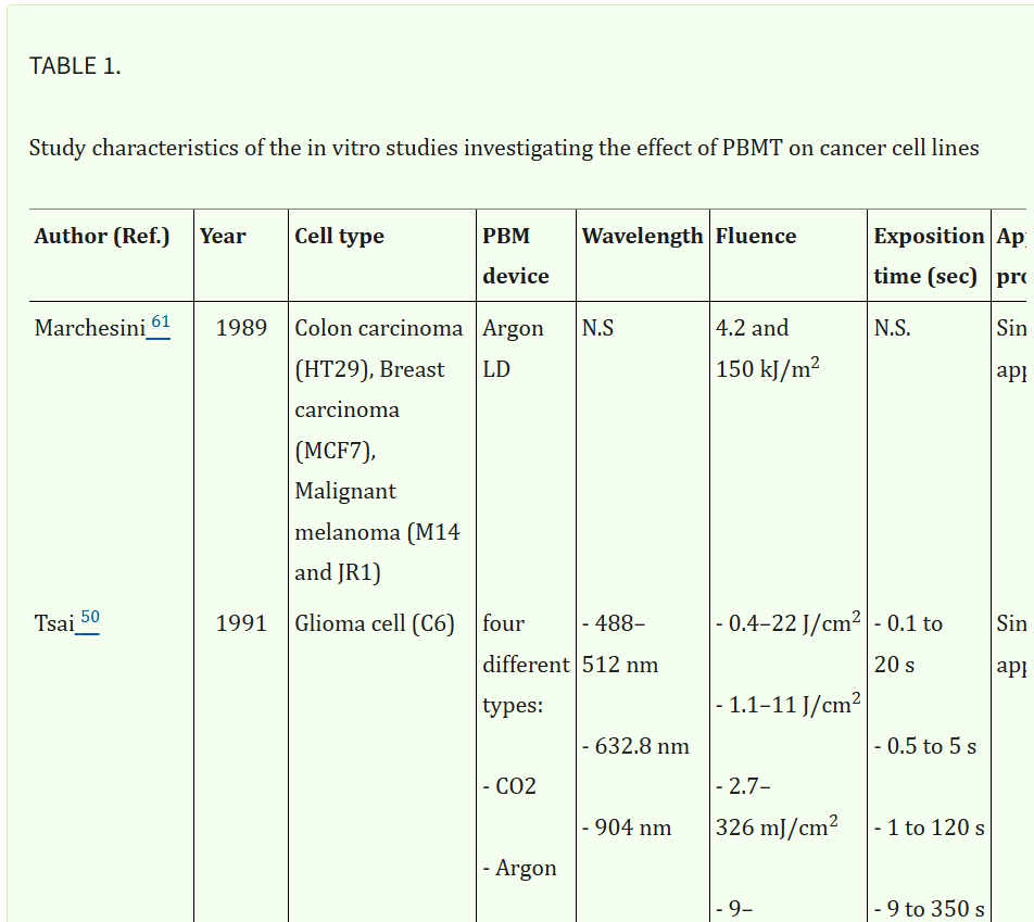 "The described results indicate that diverse malignant cells may react differently to specific PBM parameters and doses. A possible explanation for this lies in the dissimilarities in the cellular microenvironment between different tumor models, as [red light therapy has a clear effect on the cellular signal transduction pathways." (45)