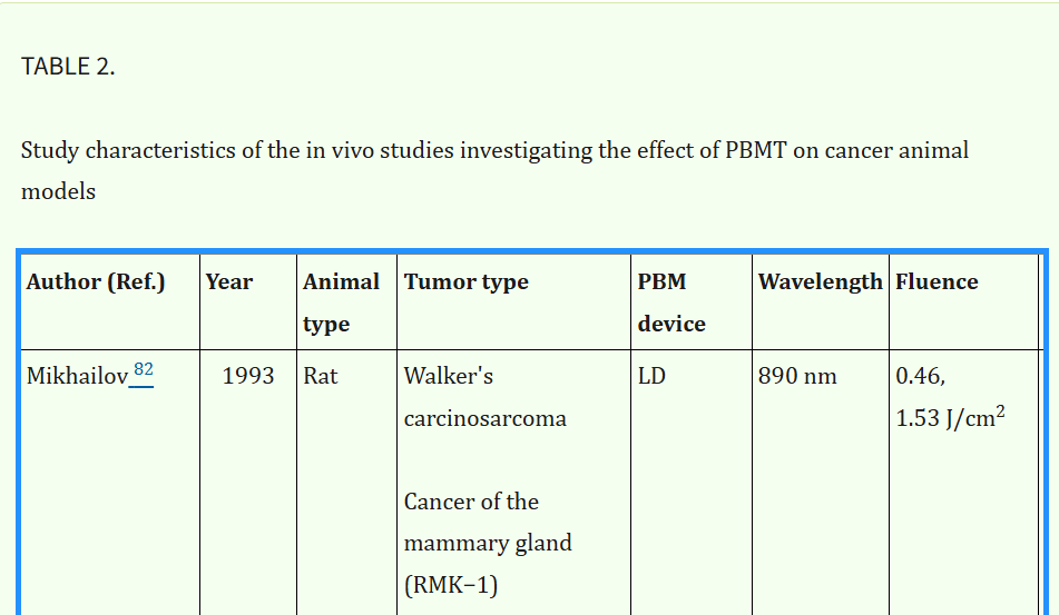 But back to the excellent review I was talking about (45). The good thing here is that we've got animal studies where the animals do have different cancers. These animals are then mostly treated with 650 - 670 nm red light, but some studies also use blue, green, and near-infrared.