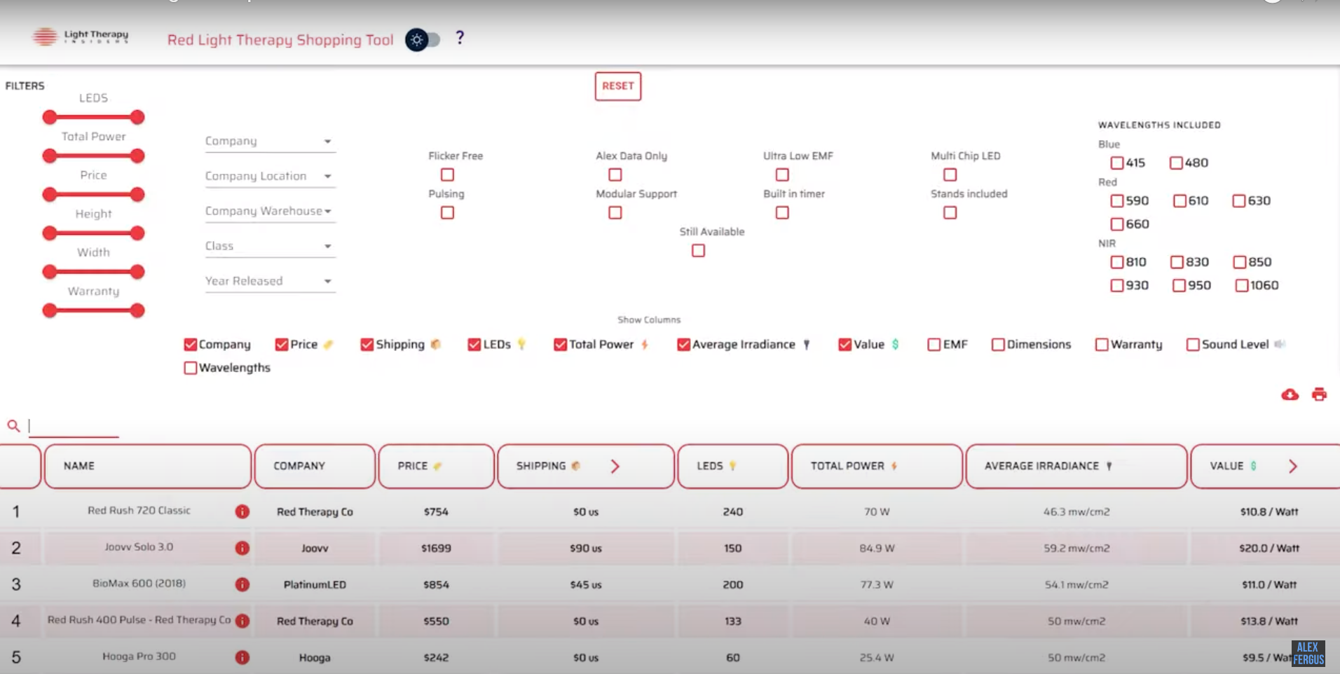 I'm ranking the panels on irradiance in this round. The greater the power concentration, the more light energy going into the body and also the deeper it's going to penetrate.