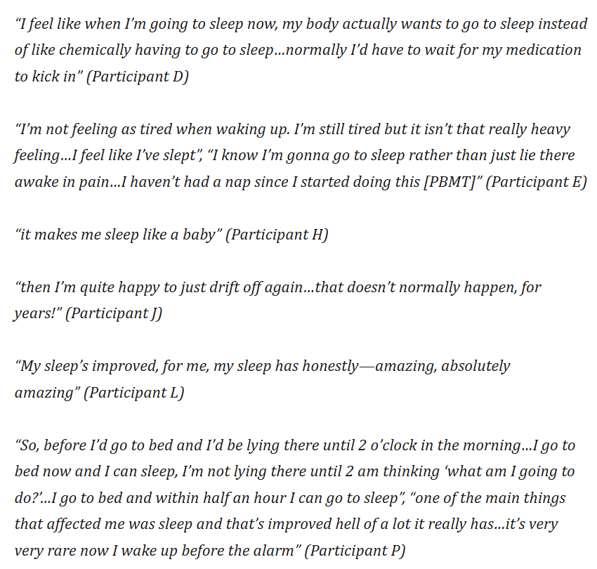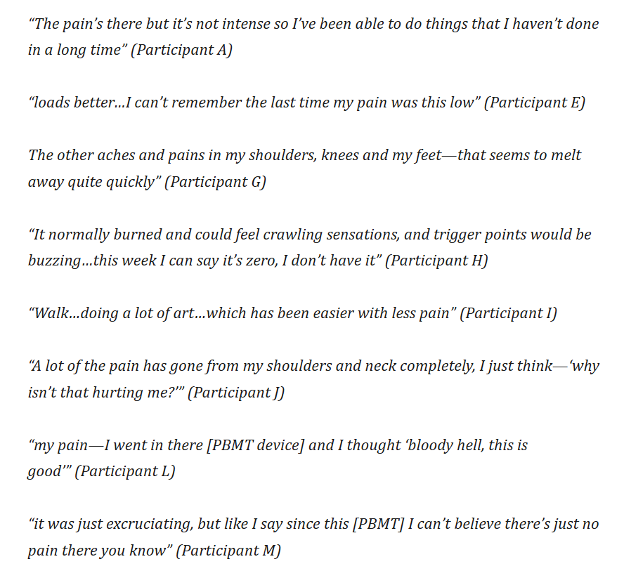 - Another study investigated whole-body light therapy using a NovoTHOR device (21; 22). The outcome is qualitative, however, and thus ventures into the personal lived experience of the participants (22). That NovoTHOR emits 660 and 850 nm, and I've tested that device myself at PBM 2024. The results of the study are quite breathtaking, to be honest, with amazing outcomes for the participants. Here are some examples that you can read, starting with pain (22):