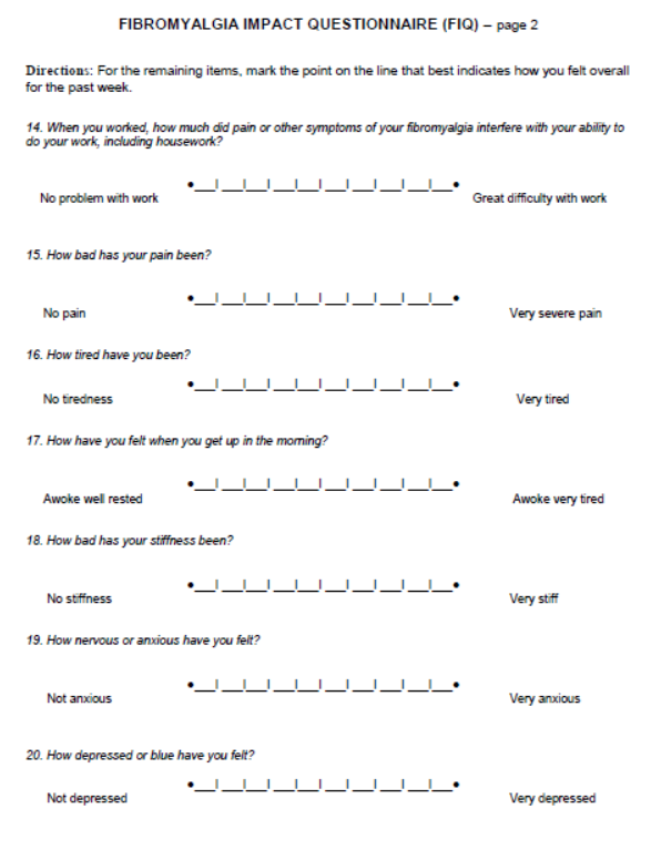 - A 670 nm study with spot treatment, at a whopping 670 mW/cm2 for 4 J/cm2 on 18 tender points, showed good improvements (34). Twelve treatments over 4 weeks were used. Both pain and activity levels improved. The aforementioned FIQ was used here - here's an example of some of the questions of the FIQ (35):