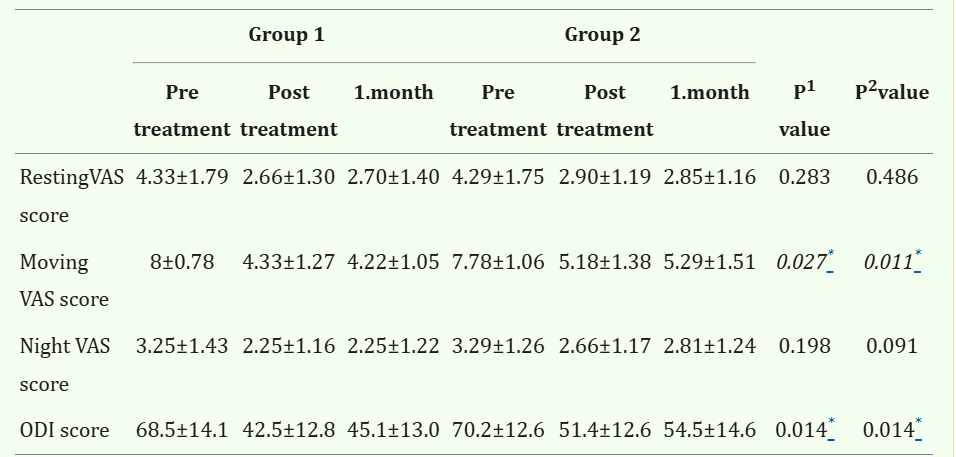 "Group 1 (n:27) received 10 sessions of a combination of hot pack, TENS, US and exercise, and Group 2 (n:27) received hot pack, HILT and exercise." (22).