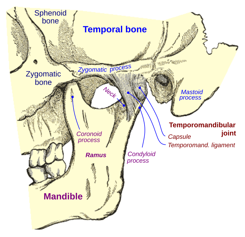 Let's first introduce the topics of "TMD" and the aforementioned "TMJ". "TMJ" stands for the joint itself in your jaw. "TMD" stands for Temporomandibular Disorders and signifies the health condition. That term sounds extremely complex, but it's simply the dysfunction of the main jaw joint that you can see in the picture below, plus adjacent tissues: