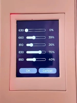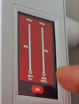 - Touchscreen panels — Some panels, like the BioMax, let you set output levels for each wavelength group in a custom mode. If NIR is set to 0%, those LEDs will truly be off. Make sure both red and NIR are set to 100% for full output.