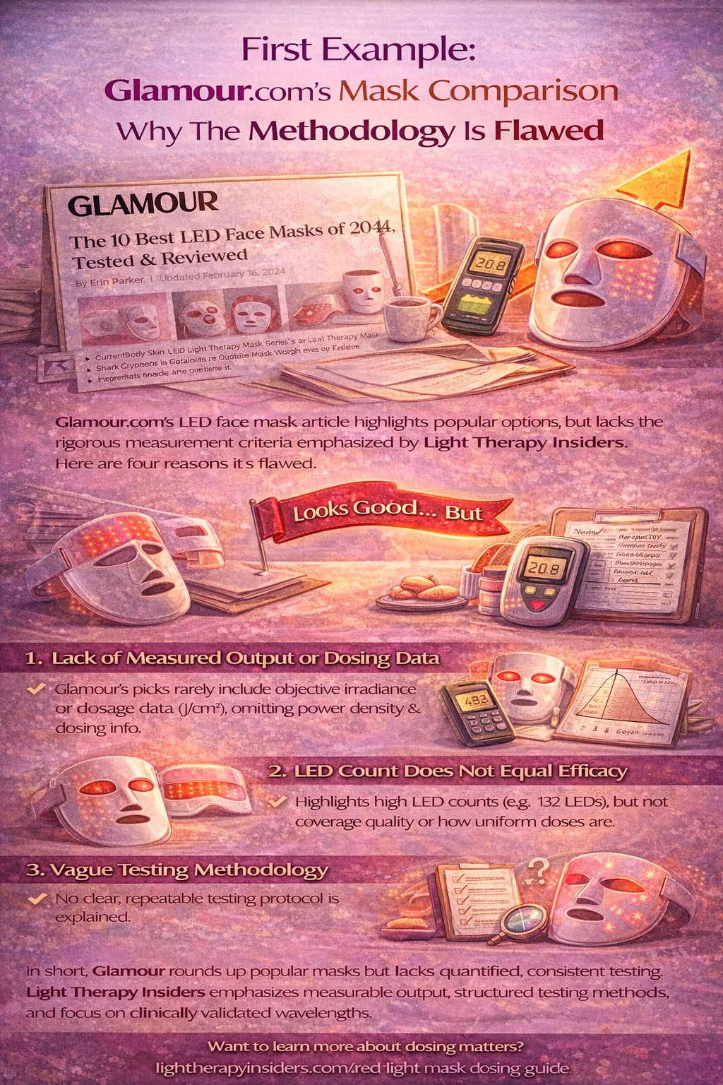 Unlike Light Therapy Insiders’ testing, which uses spectrometer readings to quantify irradiance and fluence (J/cm²) across facial zones, the Glamour piece rarely, if ever, includes measured light output, power density, or real dosing information. Without these, it’s impossible to judge whether a mask delivers a therapeutically effective dose — the key determinant of real biological impact.