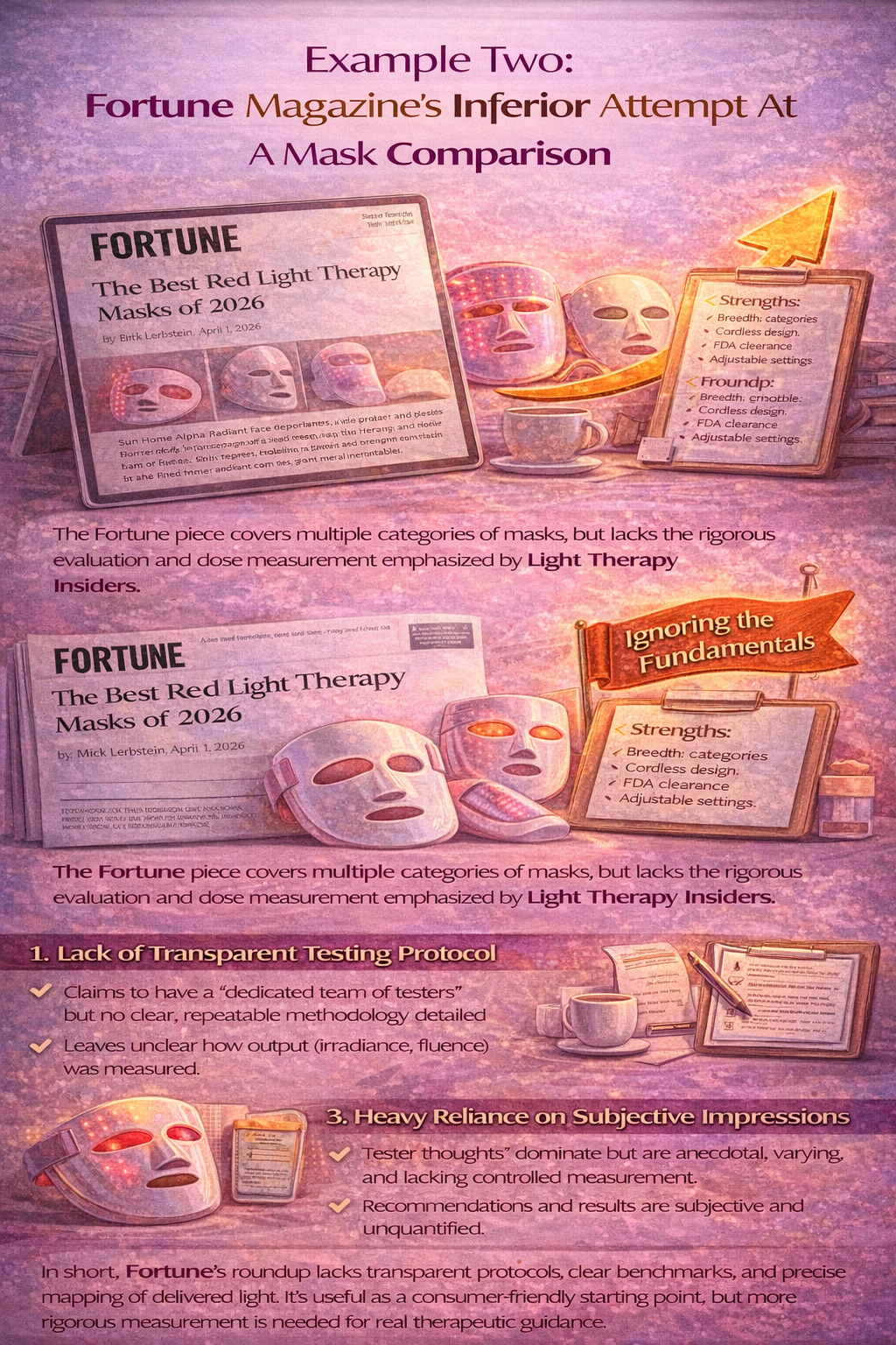 While Fortune claims a “dedicated team of testers,” there is no clearly documented, repeatable methodology. There are no details about how irradiance or fluence were measured, what tools (e.g., spectrometers) were used, or whether measurements were taken at consistent distances and across multiple facial zones — all practices that Light Therapy Insiders considers essential for valid comparisons.