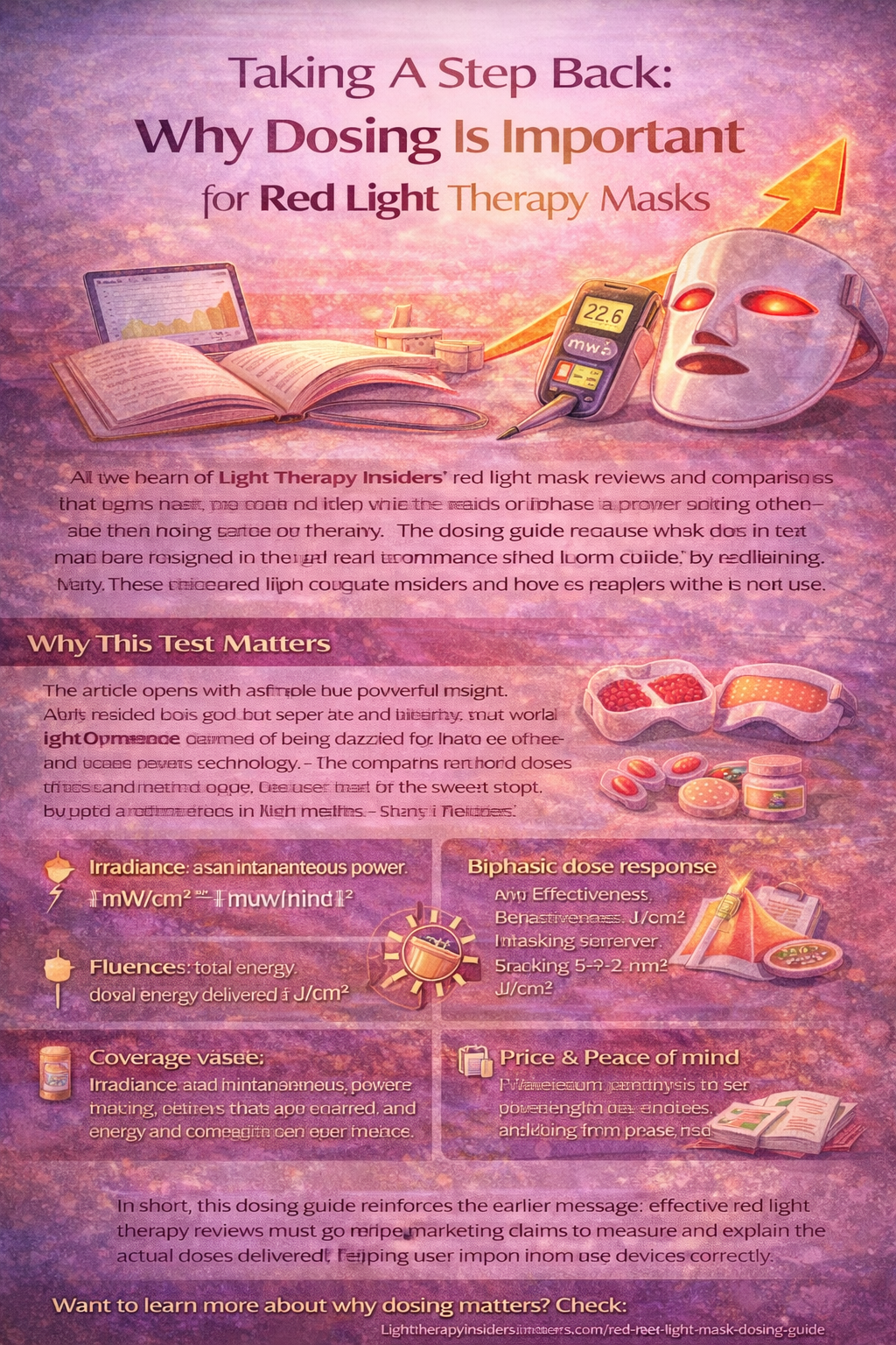 At the heart of Light Therapy Insiders’ red light mask reviews and comparisons lies a core truth: you can’t judge a device’s value without understanding dose — the actual energy your skin receives. The dosing guide builds on the rigorous testing methodology used in the 25-mask comparison and buyer’s guide by explaining why those measured light outputs matter, and how to interpret them in real use.