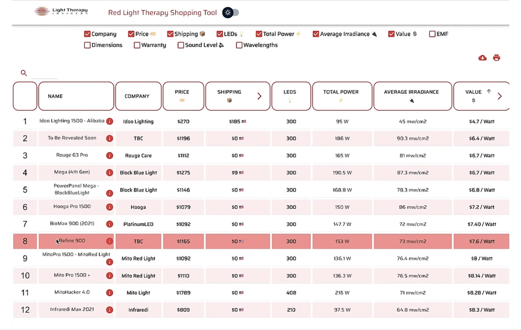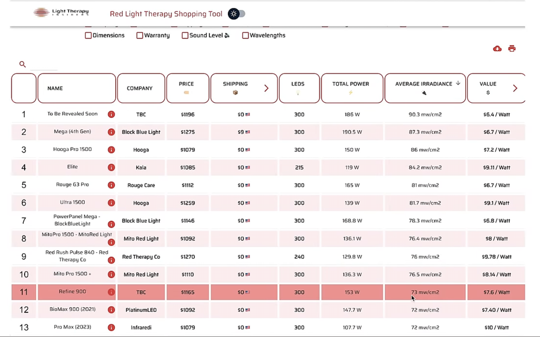 Let’s use the Light Therapy Insider shopping tool to compare prices. I have filtered for wall panels and will rank them by value. Remember, a lower rank is better.