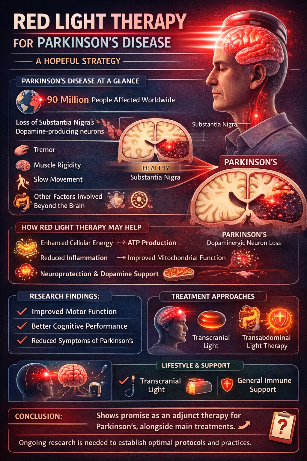 Overall, the article concludes that red light therapy is a promising supportive therapy for Parkinson’s disease, but it should be used alongside conventional medical treatments rather than as a replacement for them.
