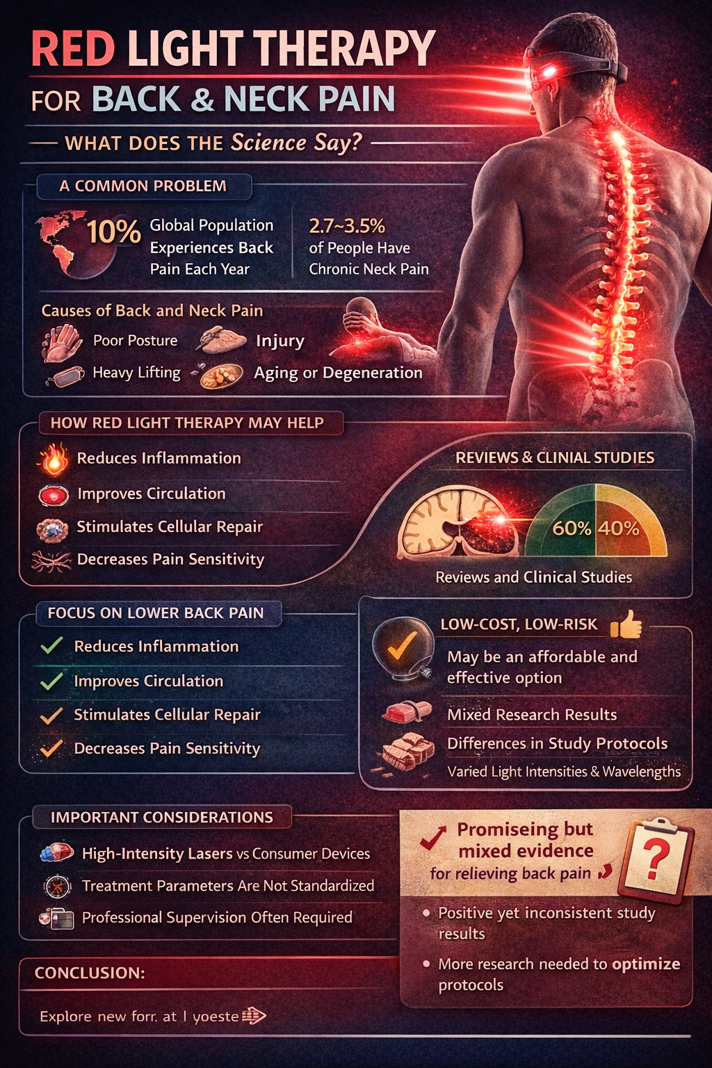Overall, the article concludes that red light therapy shows promising but mixed evidence for treating back pain. While many studies suggest potential benefits, more standardized research is needed to determine optimal wavelengths, dosing protocols, and treatment methods for both clinical and home use.