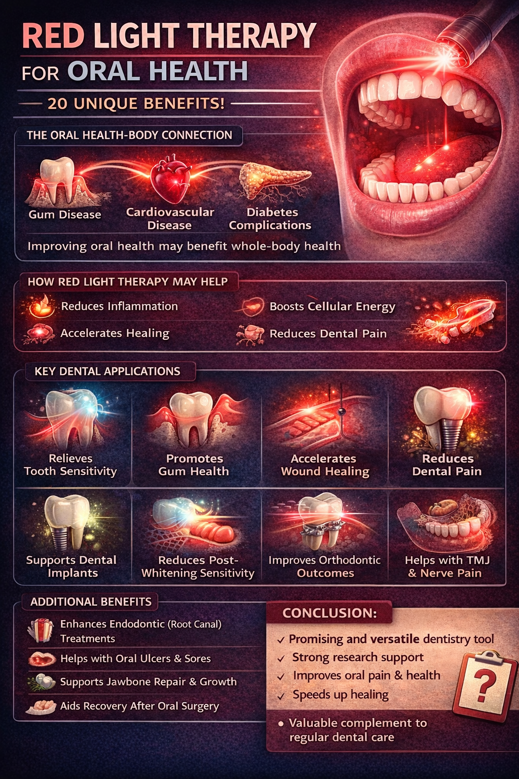 Overall, the article concludes that red light therapy is a promising and versatile tool for dental health, with strong research support for reducing pain, improving gum health, and accelerating healing. While not a replacement for conventional dental care, it may become an increasingly valuable complement to standard treatments in both clinical and home settings.