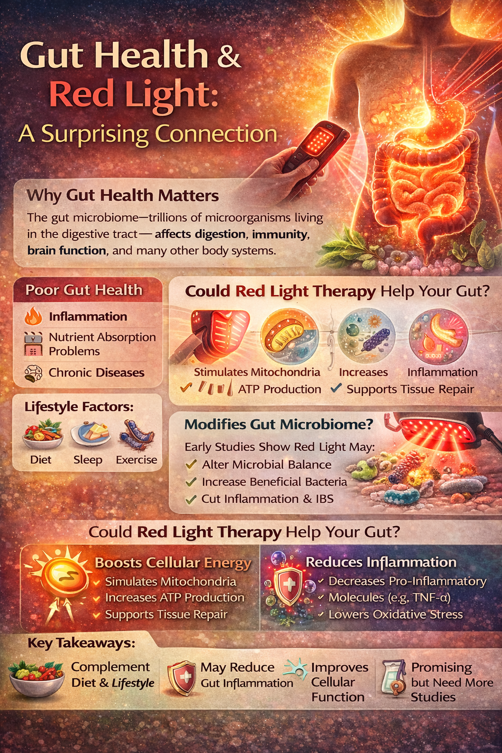 The article “Gut Health & Red Light: A Surprising Connection” explores how red and near-infrared light therapy (photobiomodulation) may support gut health and digestive function. It begins by emphasizing that gut health is central to overall wellbeing because the gut microbiome—trillions of microorganisms living in the digestive tract—affects digestion, immunity, brain function, and many other body systems.