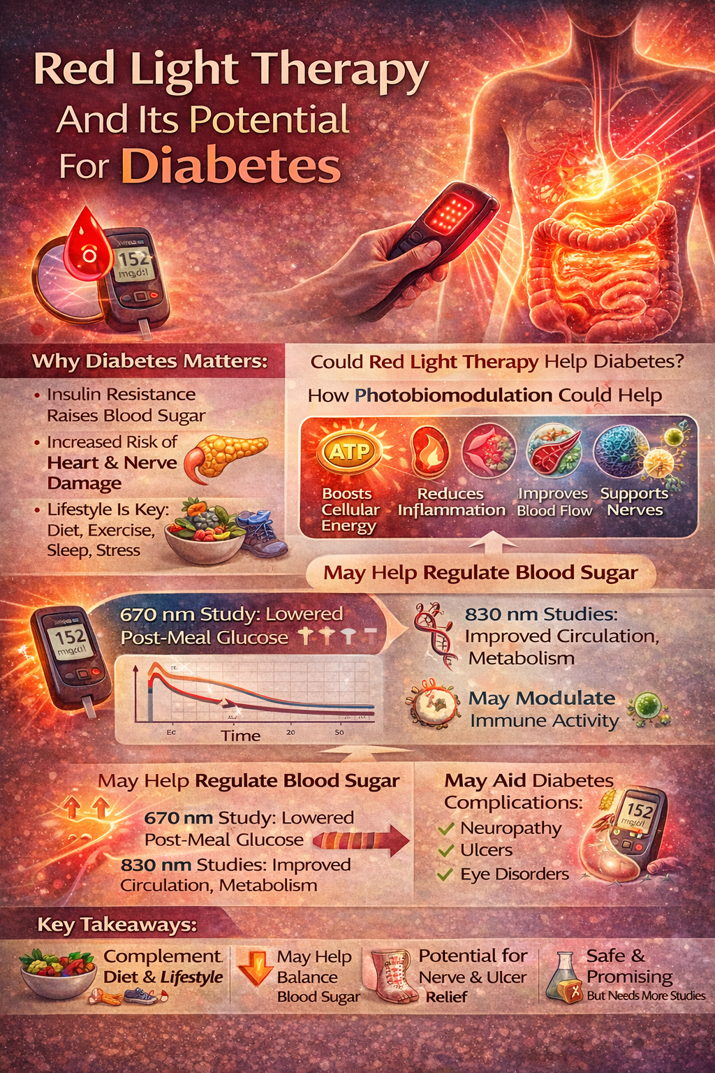 Beyond blood sugar control, the therapy may help with diabetes-related complications. Review studies indicate potential benefits for conditions such as diabetic neuropathy, ulcers, and certain eye problems, likely due to improved circulation and reduced inflammation. However, the article stresses that the evidence base is still developing and that optimal wavelengths, treatment frequency, and dosing protocols remain uncertain.