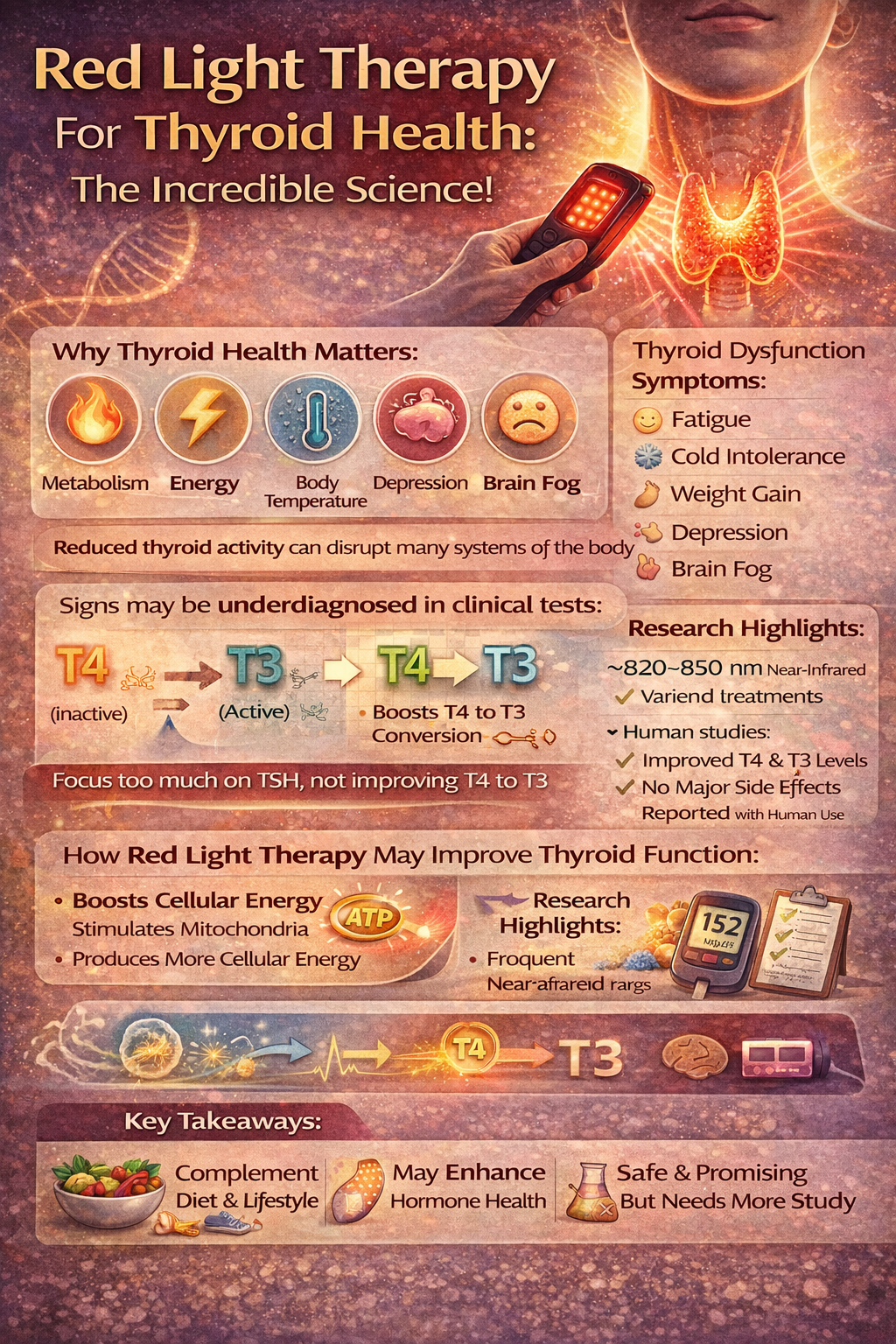 Overall, the article concludes that red light therapy shows encouraging scientific support for improving thyroid function, particularly in hypothyroid conditions. Nevertheless, it emphasizes that thyroid health is multifactorial and should also be addressed through lifestyle factors such as sleep, nutrition, stress management, and overall metabolic health.