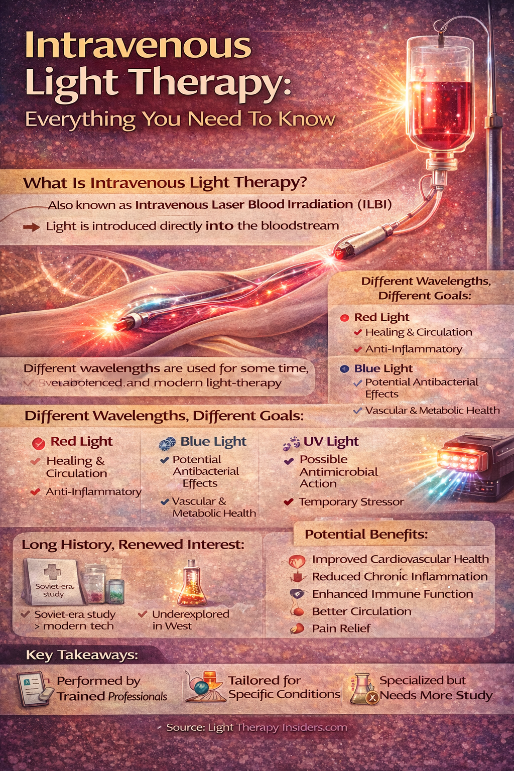 Overall, the article presents intravenous light therapy as a promising but specialized medical treatment with growing interest. While the reported benefits are broad, the therapy is generally performed in clinical settings and should be guided by trained professionals, given its invasive nature compared with conventional red-light therapy.