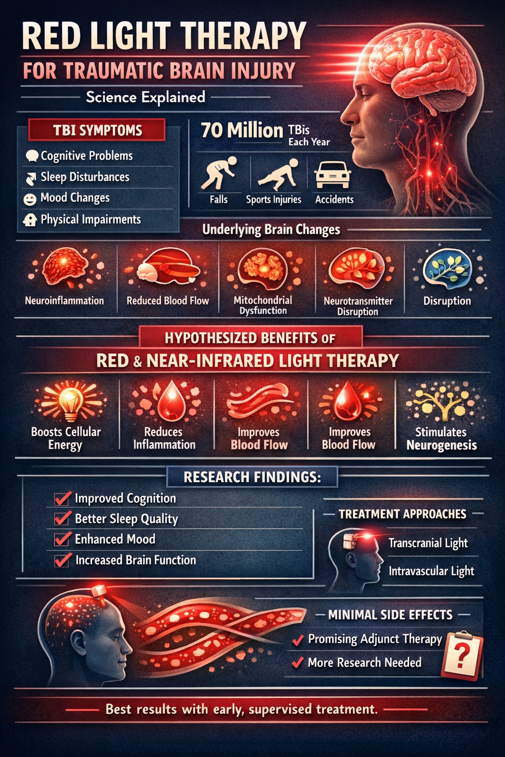 Overall, the article concludes that red light therapy appears to be a promising adjunct treatment for traumatic brain injury, though more research is still needed. Early treatment may yield the best results, and the therapy should ideally be used under medical supervision alongside conventional care.