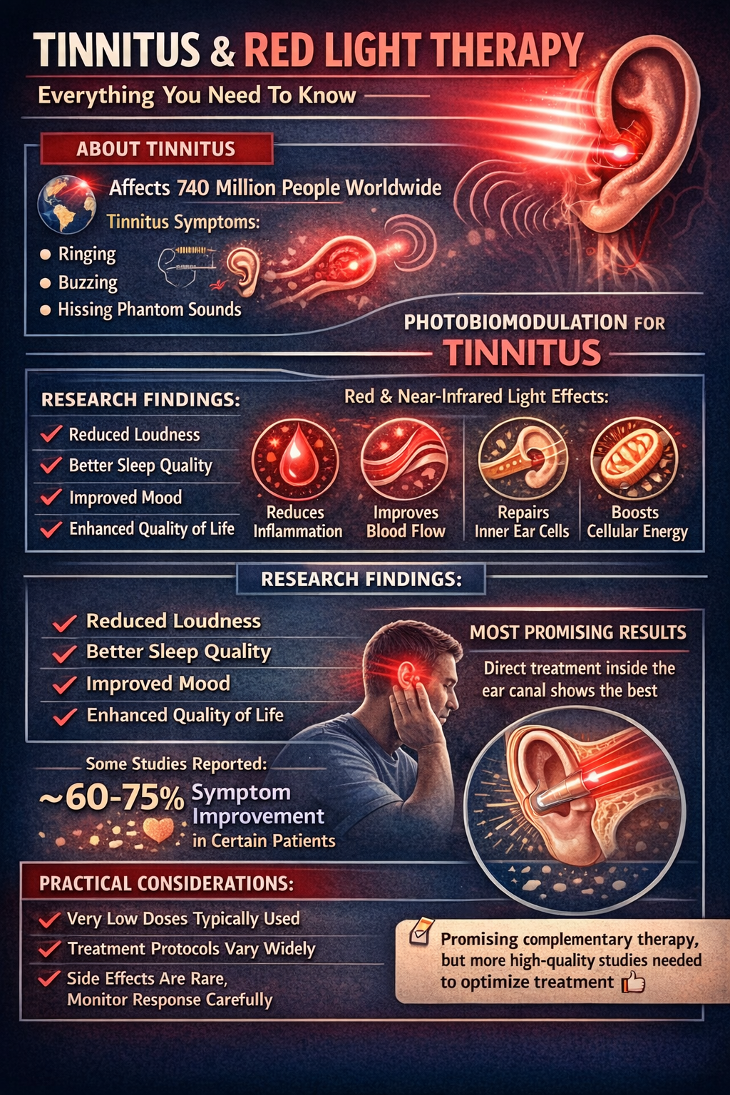 Several scientific studies discussed in the article report meaningful reductions in tinnitus severity, with some showing symptom improvements of around 60–75% in certain patients. Reported benefits include decreased loudness of the ringing and improvements in quality of life. However, the results across studies are mixed, and factors such as wavelength, treatment dose, and delivery method appear to strongly influence outcomes. Direct treatment inside the ear canal currently shows the most promising results compared with applying light externally around the ear.