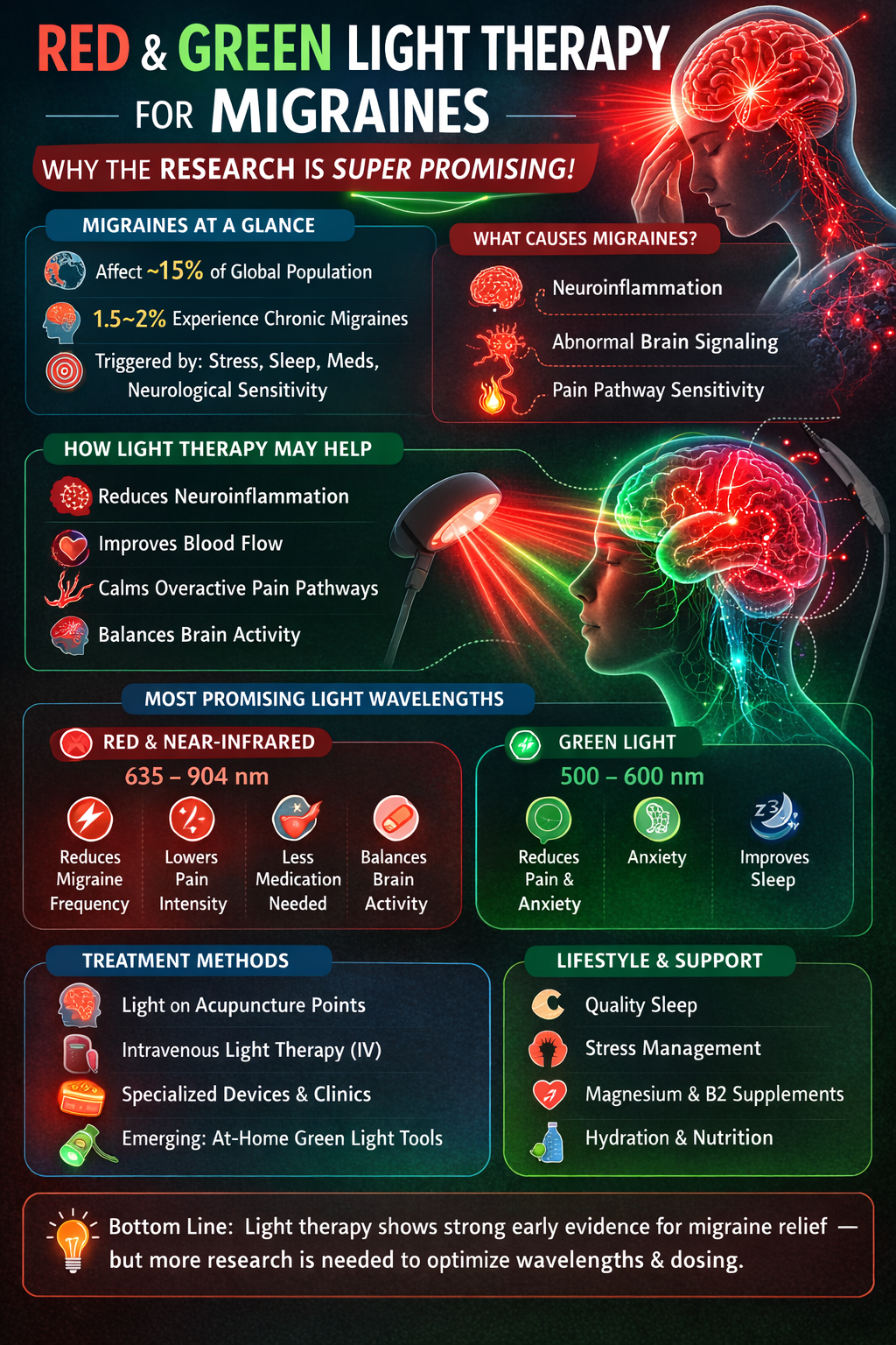 Overall, the article concludes that light therapy—especially red and green wavelengths—shows encouraging preliminary evidence for migraine management. However, larger and higher-quality clinical studies are still needed to determine the most effective wavelengths, treatment locations, and dosing protocols. Lifestyle strategies such as proper sleep, nutrition, and supplements like magnesium or vitamin B2 are also emphasized as important components of migraine management.