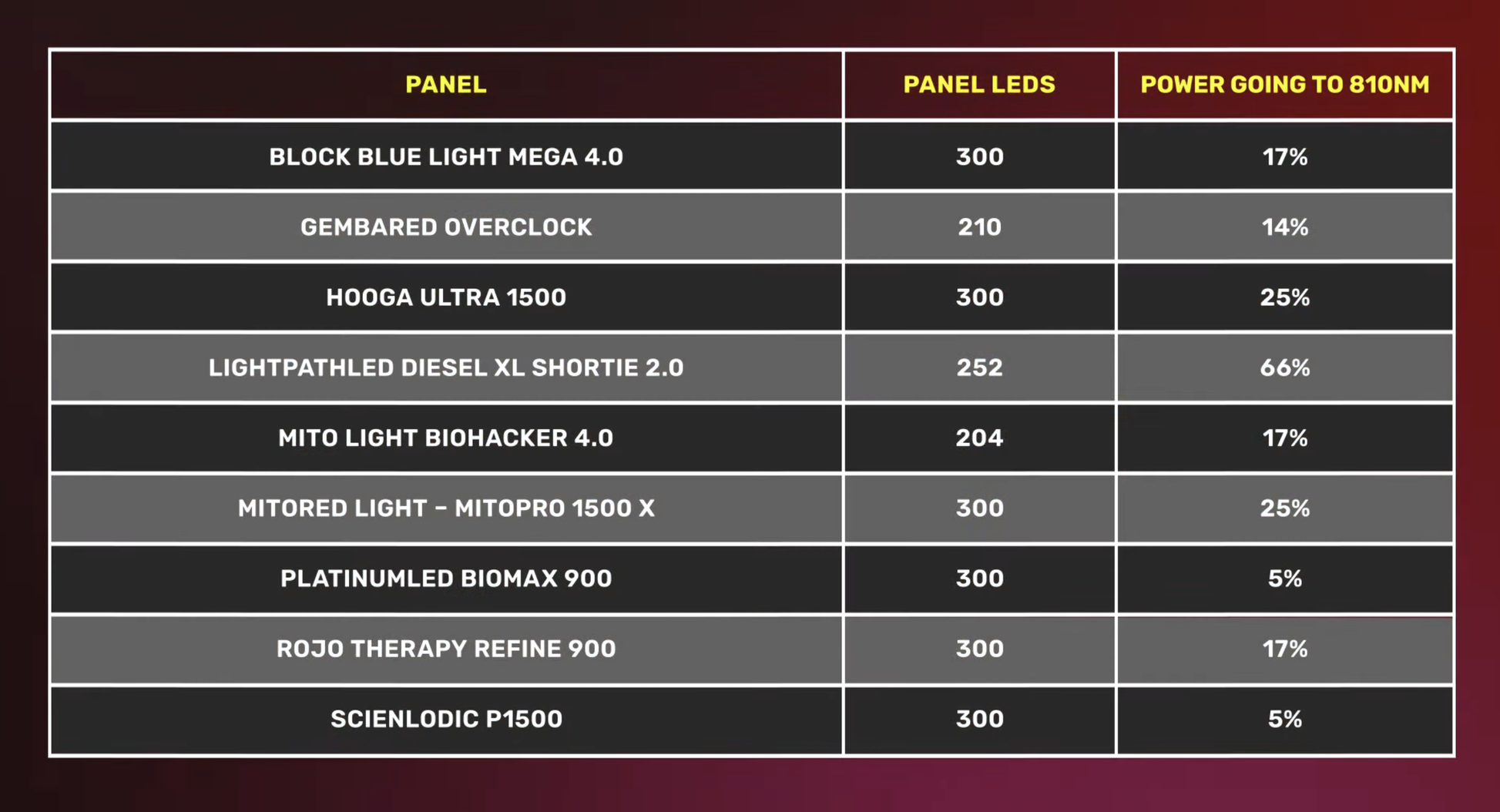 The Hooga Ultra 1500 and the MitoRed Light-MitoPro 1500 X dedicate 25% of their power to 810NM. Among the options, three had 17%, the GembaRed Overclock had 14%, and two panels had 5% power to 810NM.