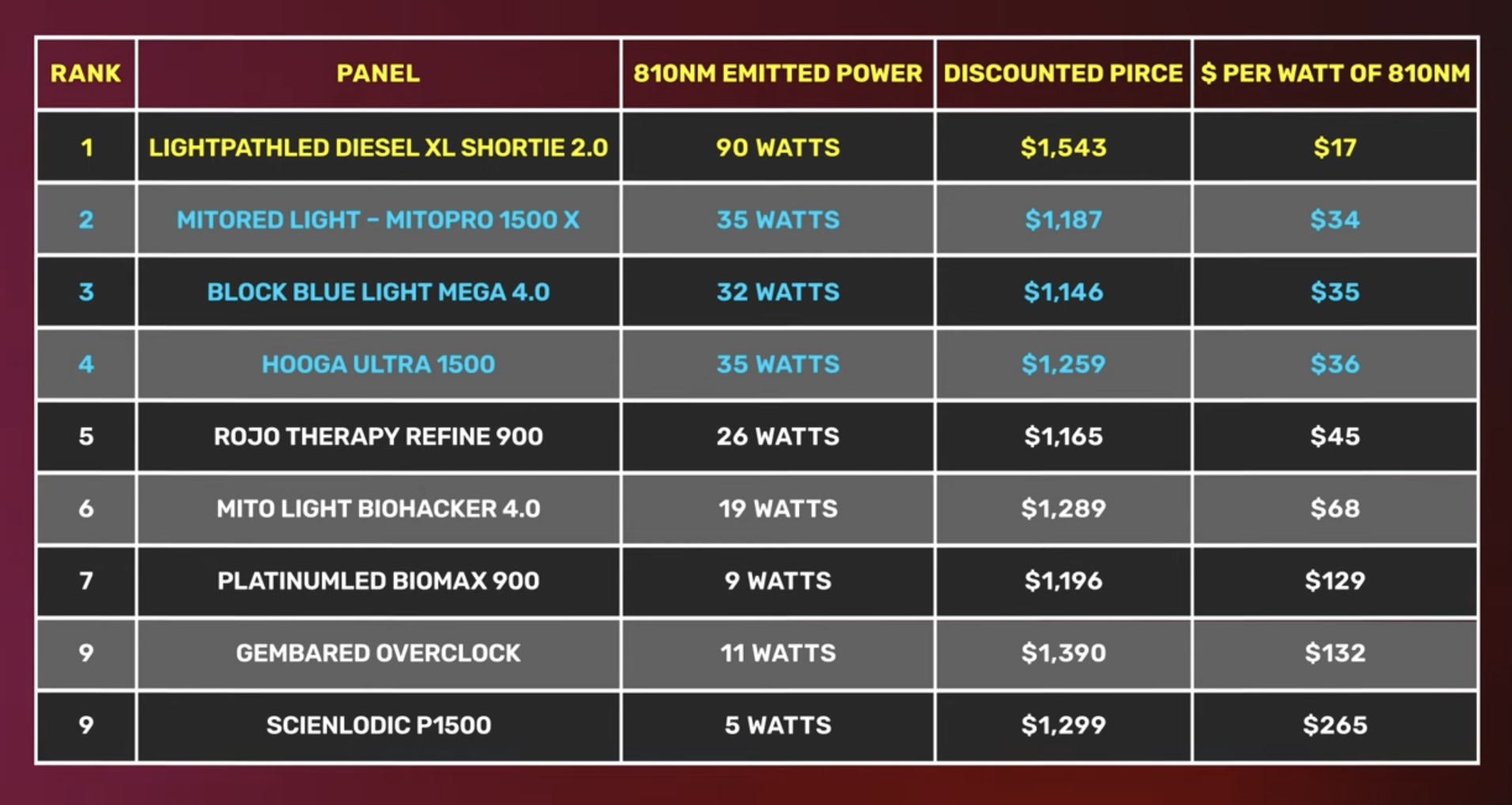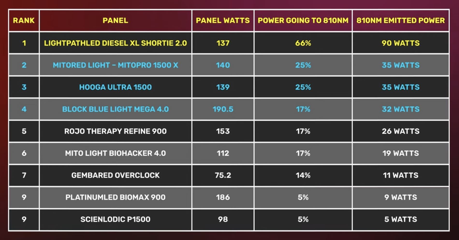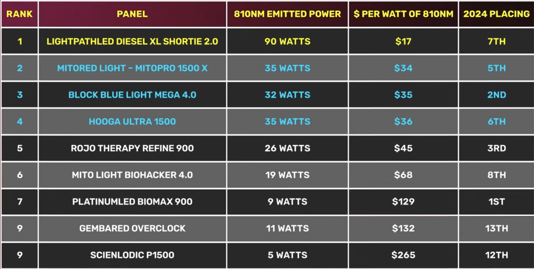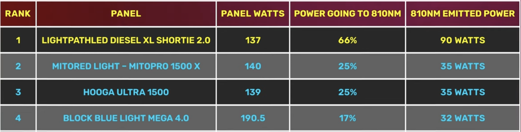 This table will be very helpful for making an informed decision. It displays all nine panels emitting 810 nanometers. you can see the amount of energy in watts emitted at that wavelength, the corresponding value, and the ranking from my 2024 Comparison Vide0.