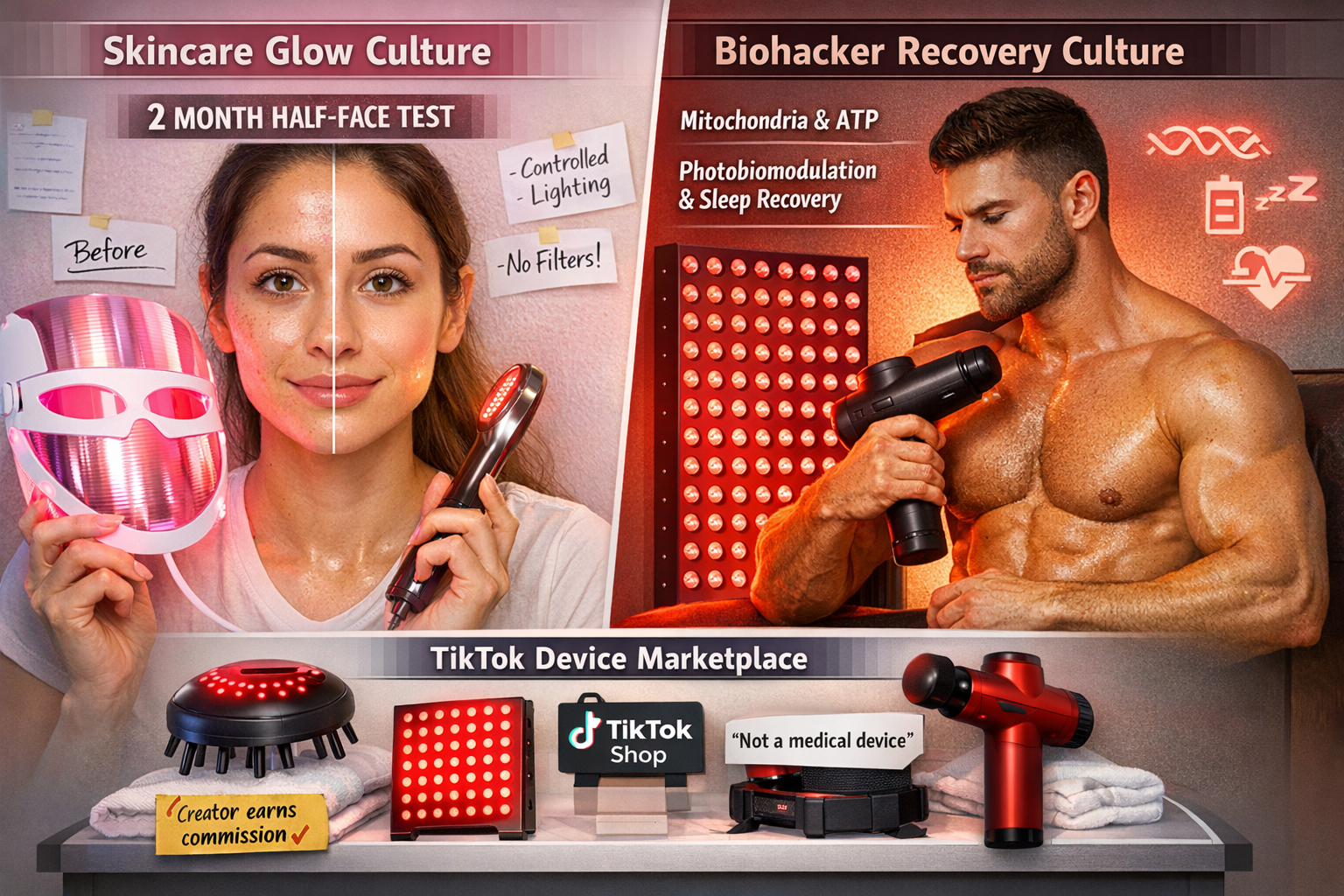 Second, the claim style splits into two cultures: Skincare glow culture (collagen, texture, breakouts, “anti-aging hack”) and biohacker recovery culture (mitochondria, ATP, “photobiomodulation,” athletic recovery, sleep). The strongest TikTok-native attempt at rigor often looks like self-experiment content—e.g., a dermatologist-style creator running a two-month “half-face” test and explicitly controlling lighting and filters. [4]