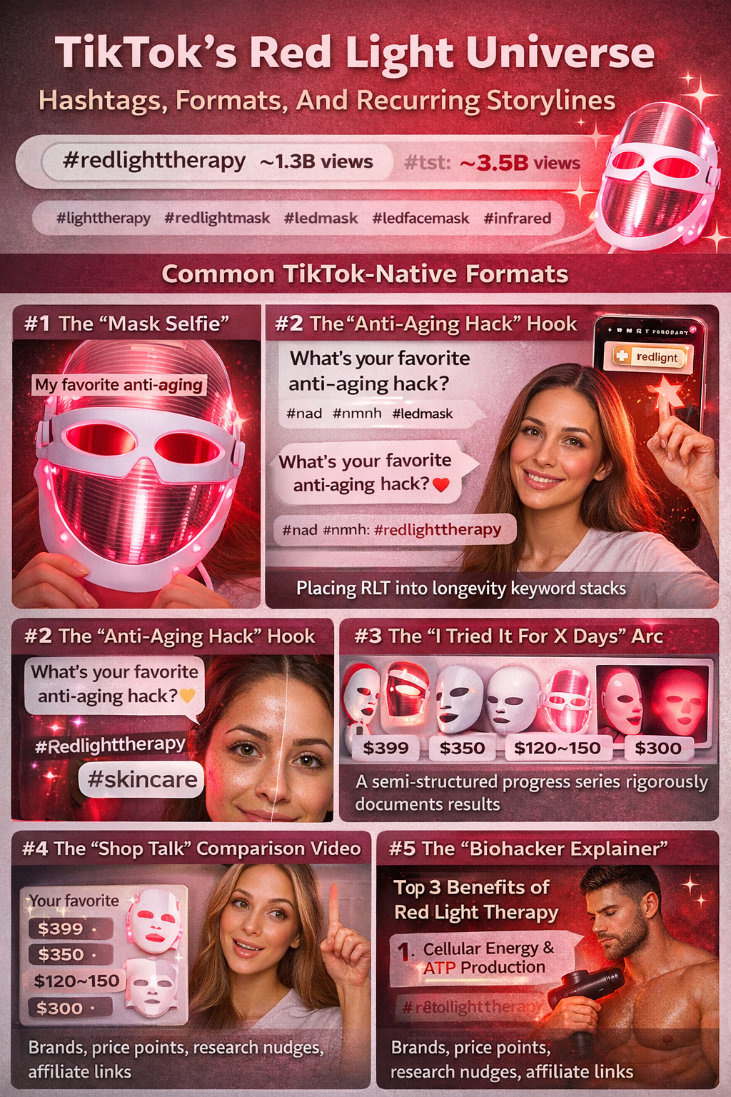 On the viewer-index side, #redlighttherapy is shown as having ~1.3B views, while #redlight is shown around ~3.5B views—but #redlight also captures unrelated meme formats, so it’s a “big tent” tag by default. [3]